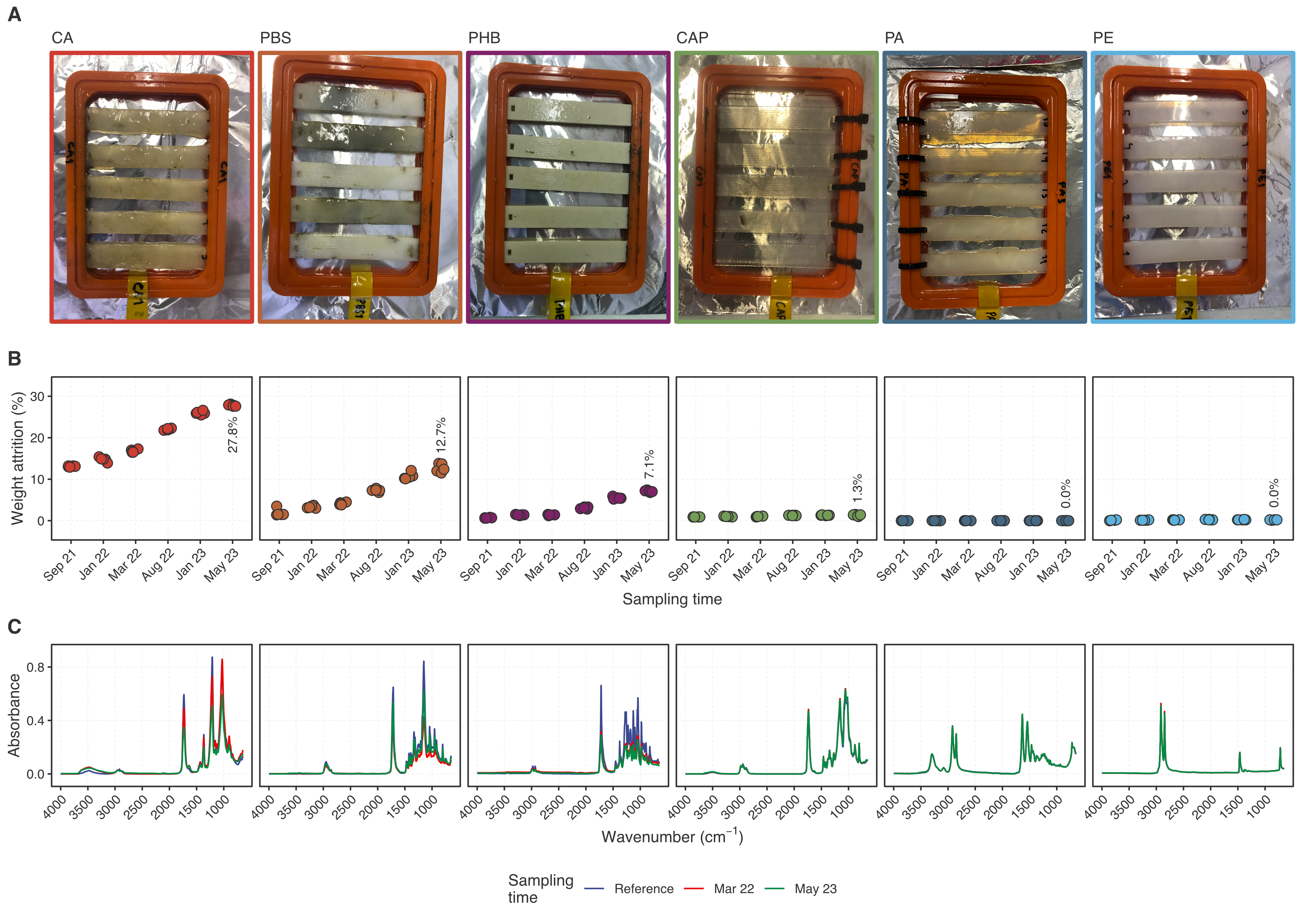 We found that not all bioplastic materials behave in the same way: cellulose acetate (CA), polybutylene succinate (PBS) and polyhydroxybutyrate-valerate (PHB) showed visible biofilm formation early on and had measurable biodegradation over time, but cellulose acetate propionate (CAP), polyamide (PA) and polyethylene (PE) degraded very little. It is important to note that even the materials that did degrade, did so very slowly: CA, the most biodegradable of the tested materials, degraded only 27.8% after almost two years under in situ conditions. This shows that “bioplastic” does not automatically mean “easily biodegradable” in real-world coastal conditions.