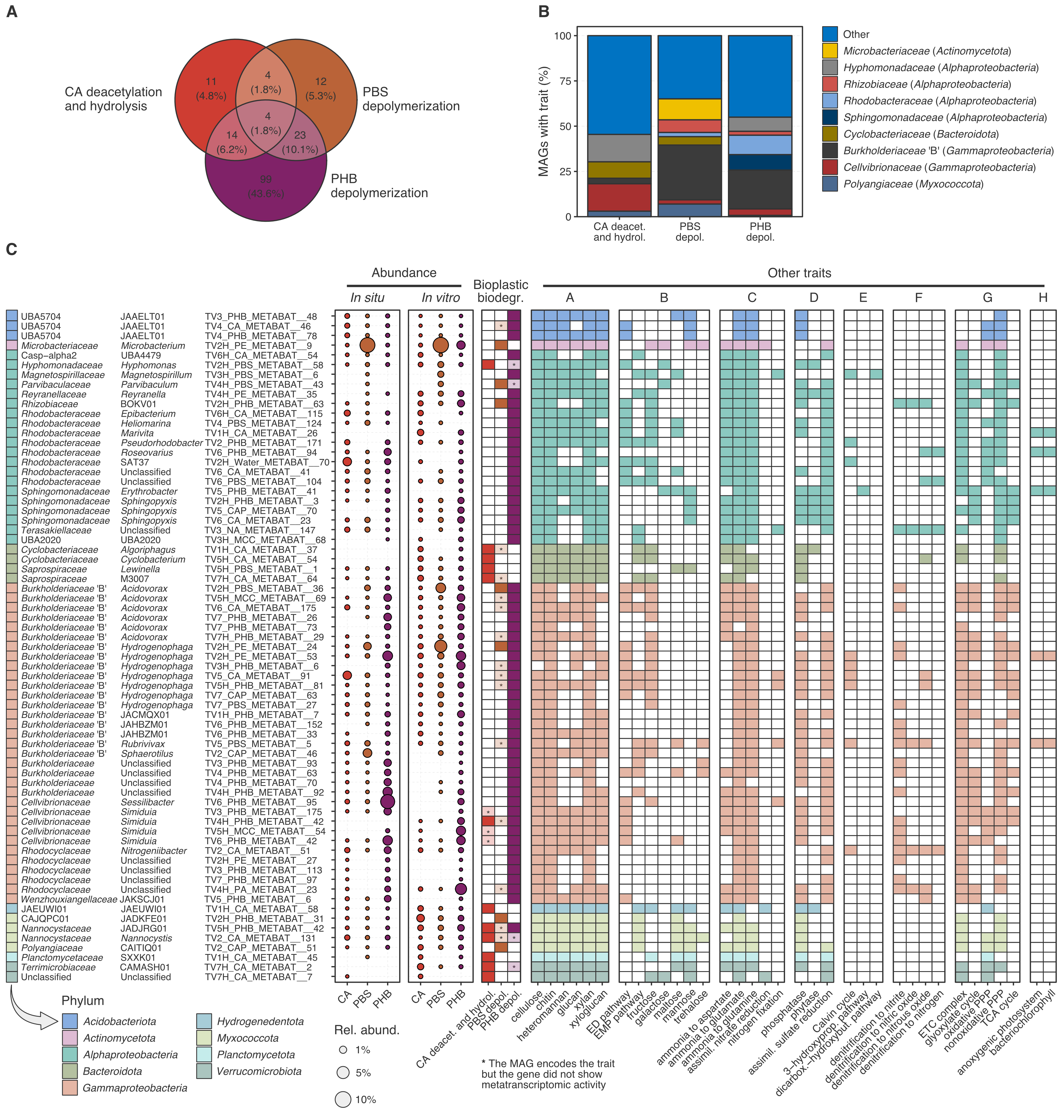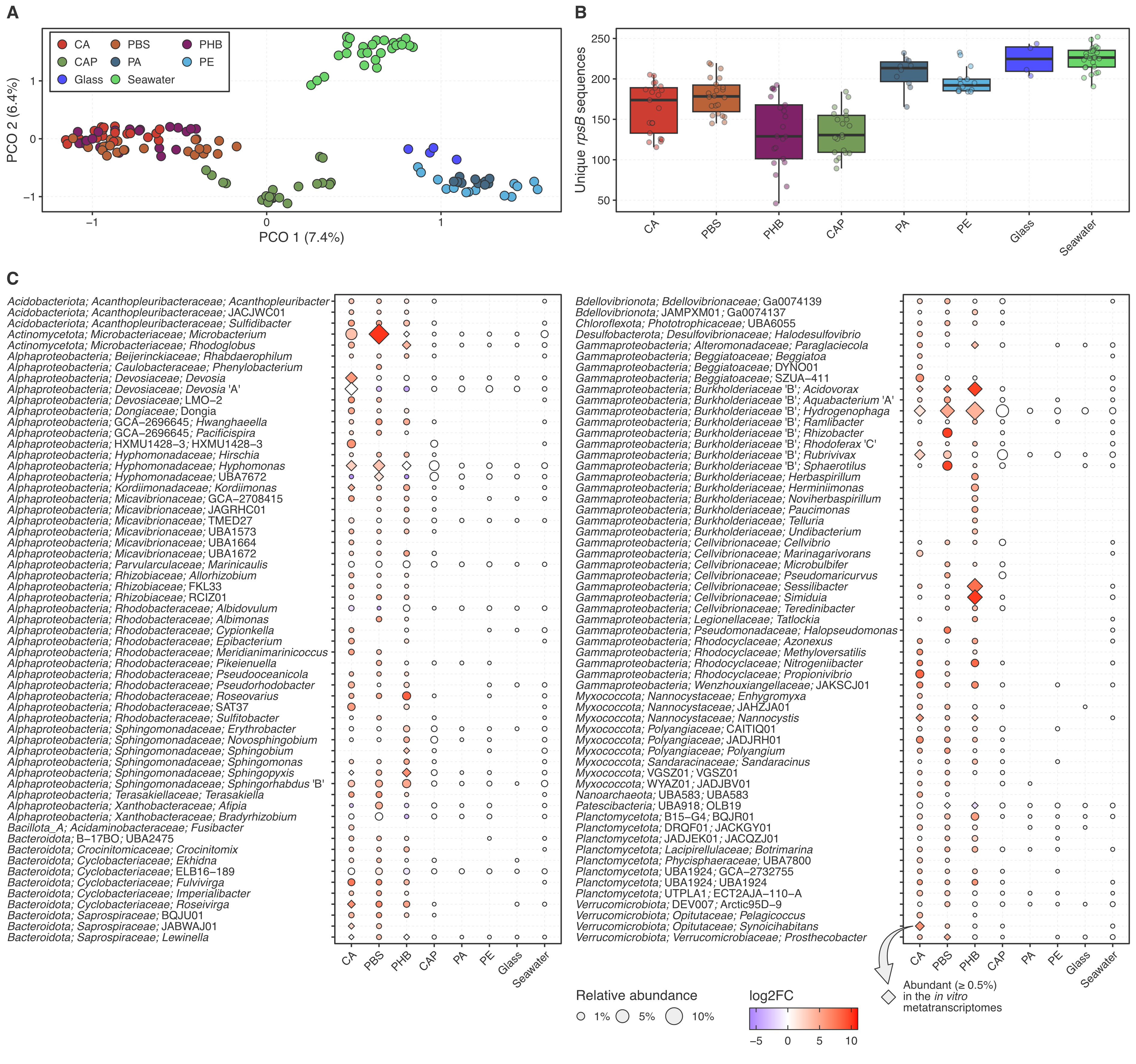 Again, the in vitro metatranscriptomes enabled us to identify the microbial populations that are likely involved in bioplastic biodegradation. Since these experiments had bioplastic as the only carbon source, the metatranscriptomic activity of bioplastic-degrading genes provided strong evidence of populations that are actively participating in the biodegradation of these materials. These included, among others, different members of the Alpha- and Gammaproteobacteria, Bacteroidota and Myxococcota, including many populations that were active in more than one bioplastic material. In addition to degrading bioplastics, the active members of the bioplastisphere appear to be aerobic heterotrophs with broad carbohydrate-degrading capabilities.