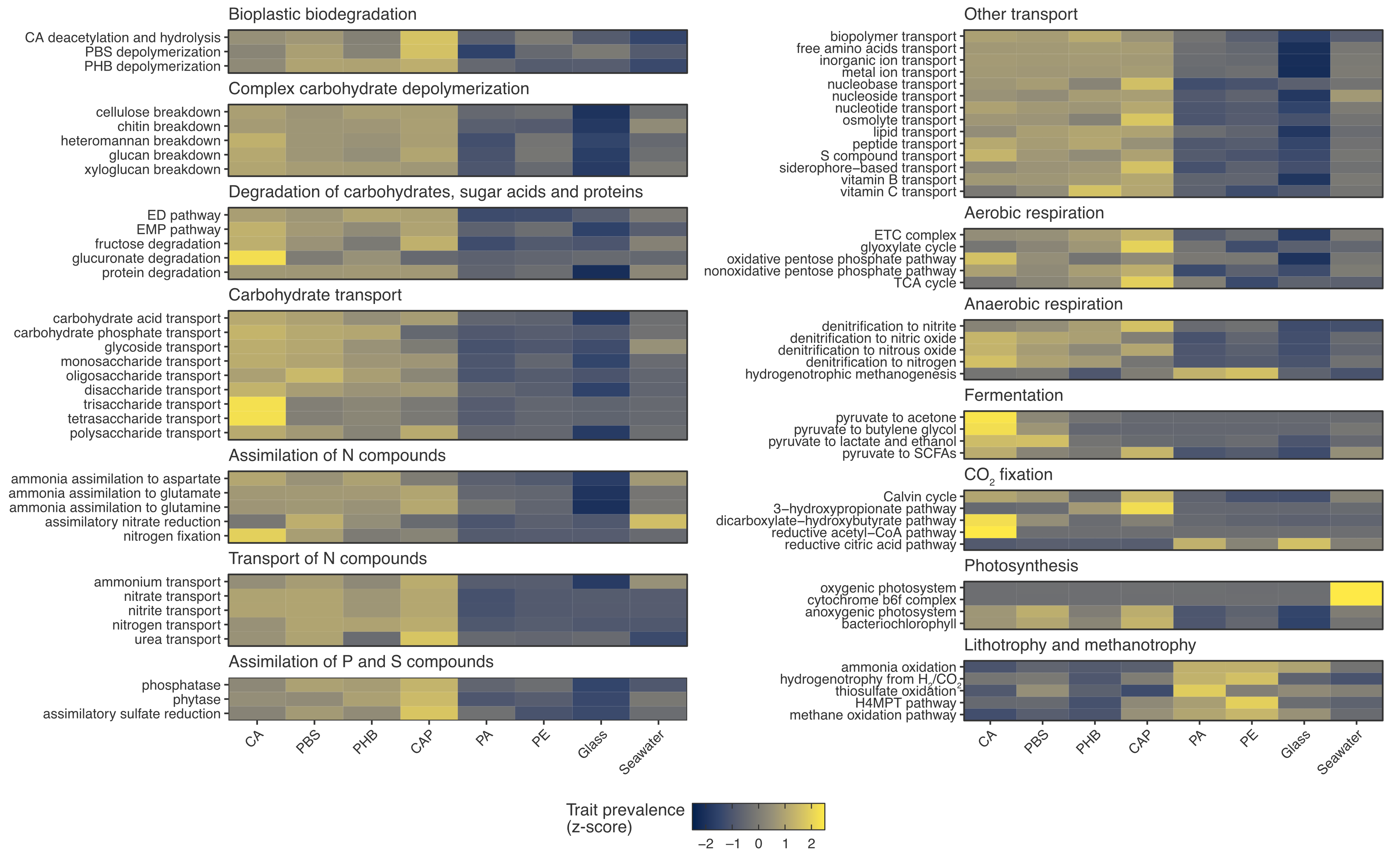 To investigate the bioplastisphere in more detail, we took a look at the genomes of over 5,000 microbial populations that we recovered from the metagenomic data, which are also known as MAGs ("metagenome-assembled genomes"). First we searched the MAGs for bioplastic-degrading genes, which are known from previous studies to be involved in the biodegradation of these materials. Not surprisingly, the prevalence of bioplastic-degrading genes was high in the microbial populations growing on the biodegradable plastics. We also found that the biodegradable plastics were enriched in genes linked to carbohydrate breakdown, nutrient transport, respiration and nitrogen cycling. The latter shows that bioplastic degradation is tied not only to carbon use but also to the local nitrogen budget, and the high prevalence of denitrification genes indicates a link between bioplastic degradation and the potential release of nitrous oxide, which is a potent greenhouse gas.